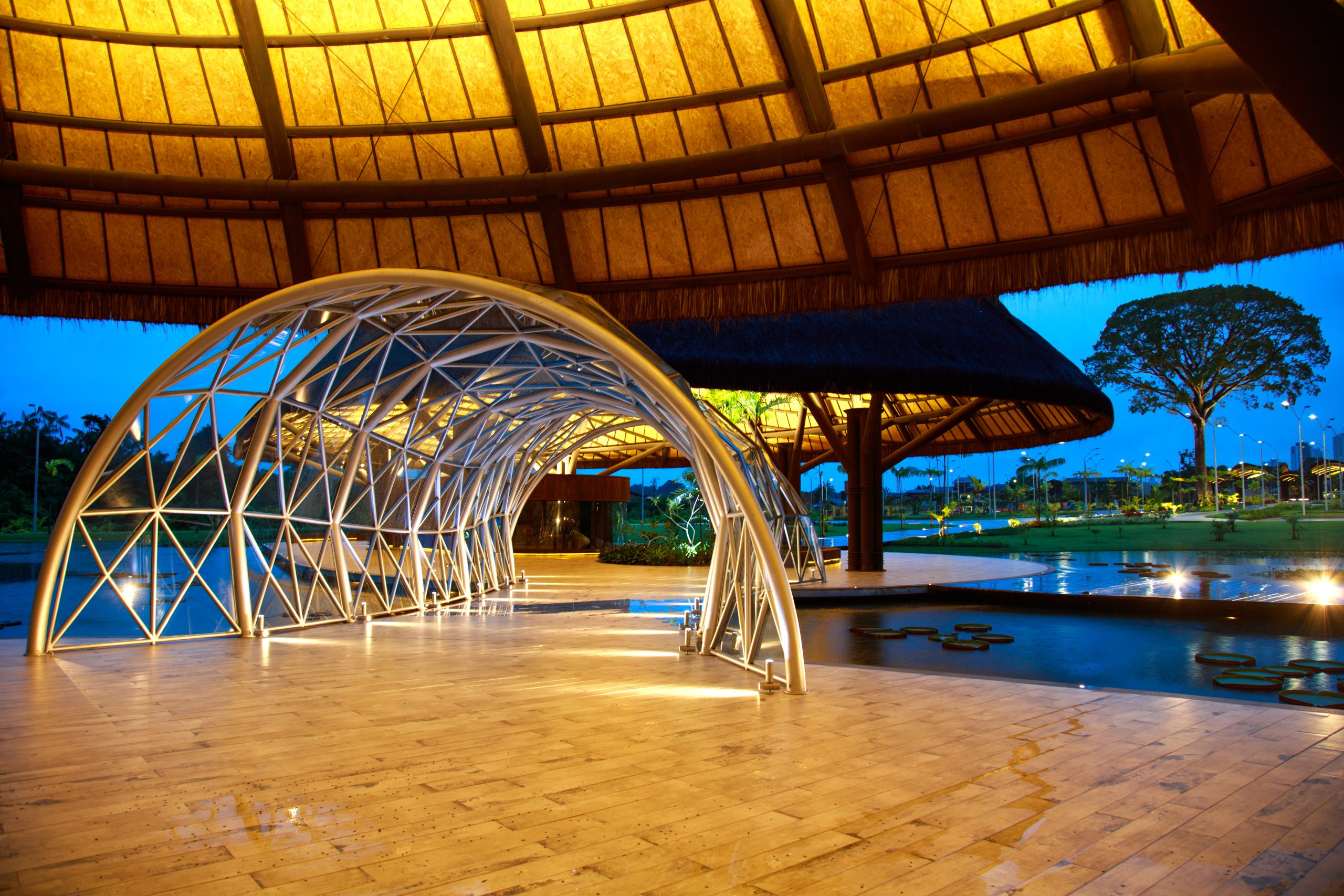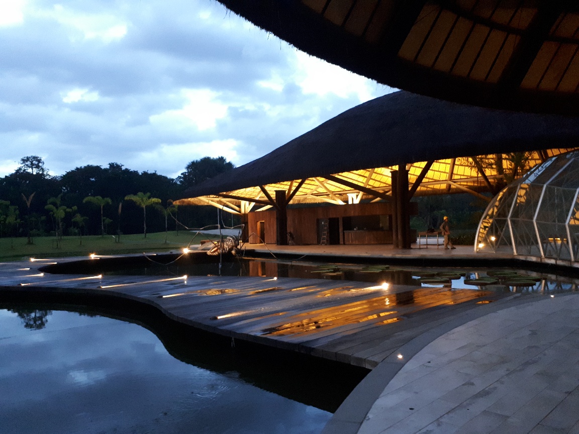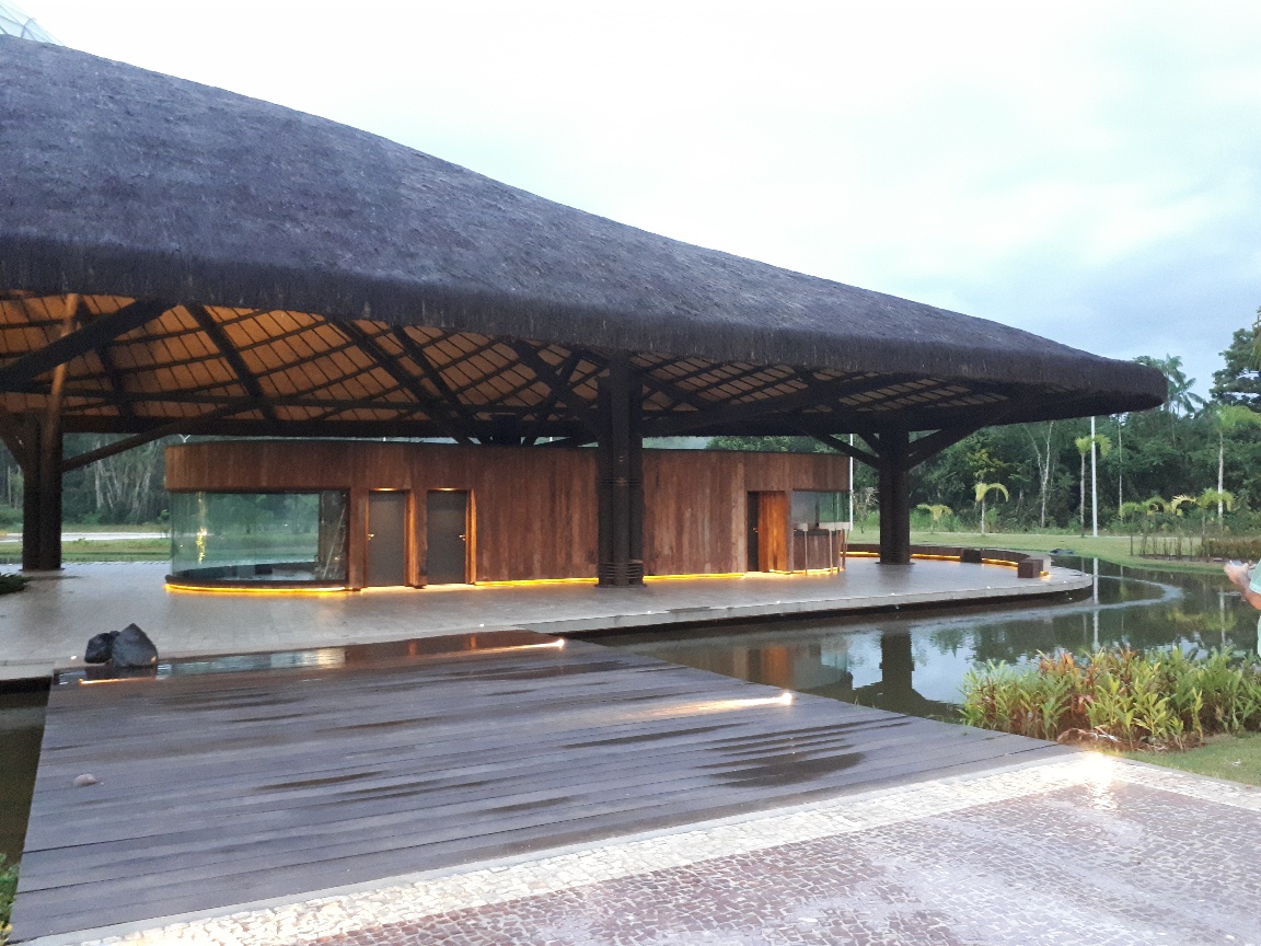 Acolhimento 1 com área de 742,48 m², destinado para guichês de estacionamento e bilheteria, sala de educação ambiental e loja. Acolhimento 2 com área de 742,48 m², destinado para área de lanchonete, banheiros, depósito e ambulatório. Os 2 acolhimentos são interligados por duas passarelas sendo uma com 49,87 m² coberta com estrutura metálica e vidro e outra com área de 201,20 m² descoberta com piso de madeira.