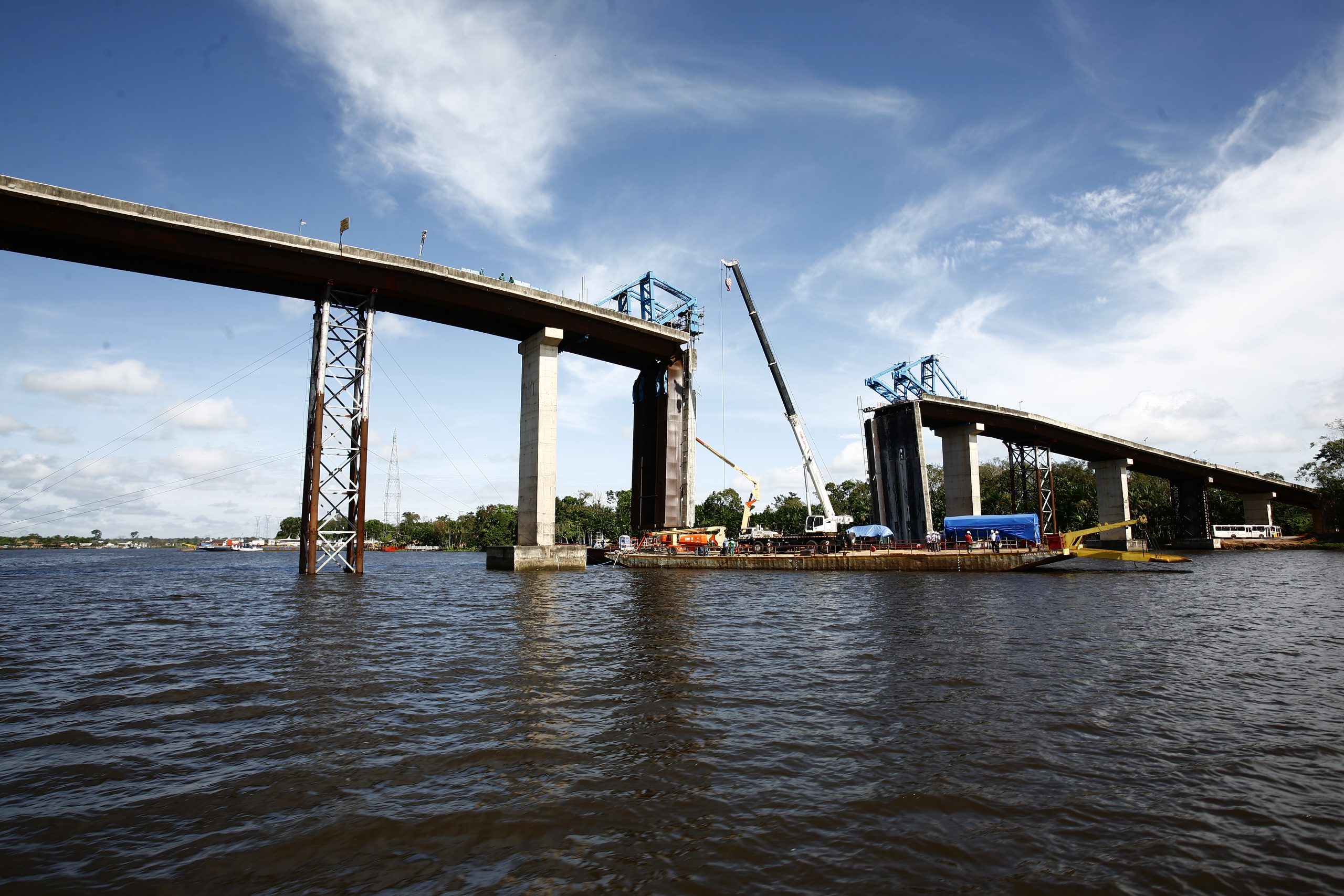 A obra da ponte sobre o Rio Moju, trata da recuperação de uma Obra de Arte Especial colapsada por acidente fluvial em decorrência da colisão de uma balsa com um dos apoios da estrutura. Com soluções técnicas arrojadas de engenharia como demolição submersa, uso de equipamentos tipo “Strand-Jack”, guindastes de alta capacidade sobre embarcações de apoio náutico, foi realizada a remoção do tabuleiro colapsado por meio de desmonte técnico, realinhamento dos pilares deslocados e reconstrução de trecho da estrutura em solução mista, aço e concreto.